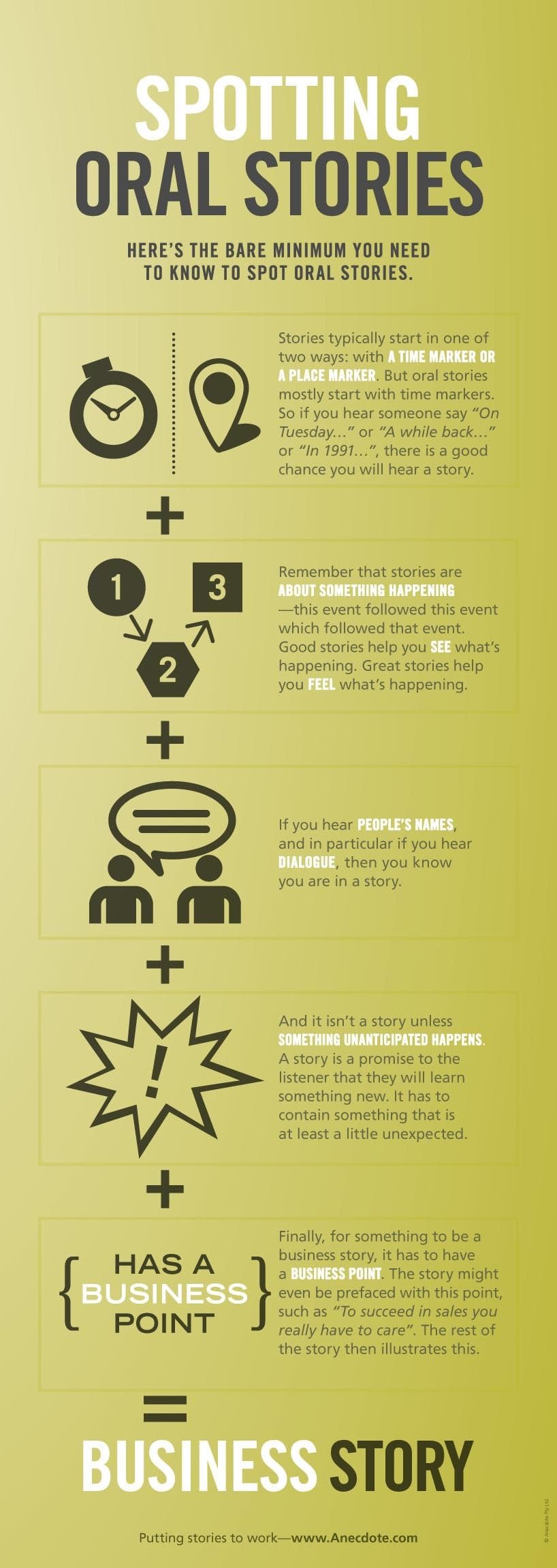 - Unanticipated information. You can also expect to hear something surprising, unknown, or an insight for the story to be effective and memorable. It doesn’t have to be amazing, just a bit unexpected.